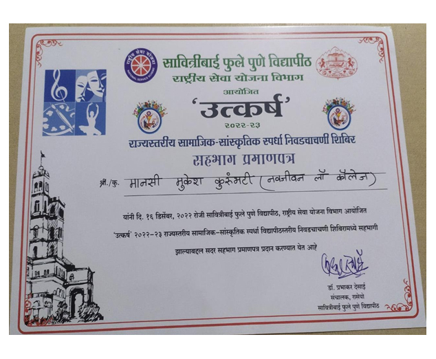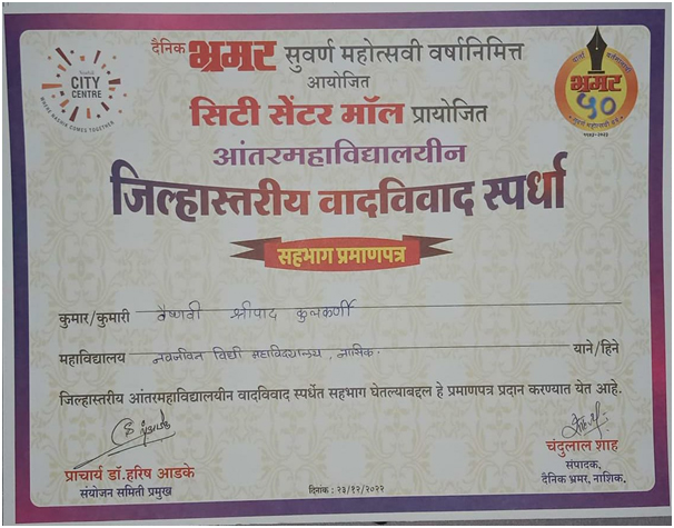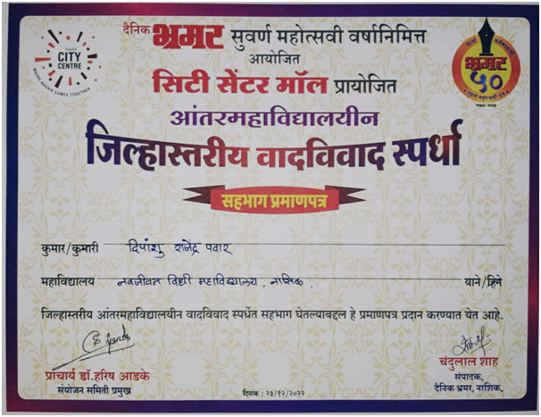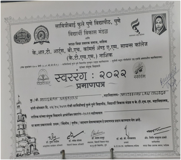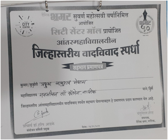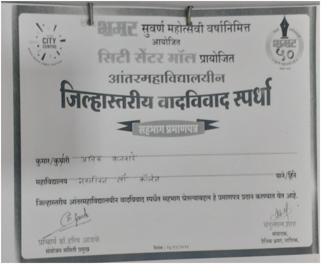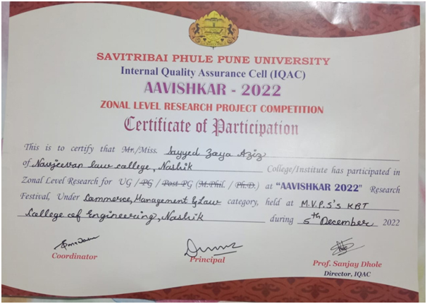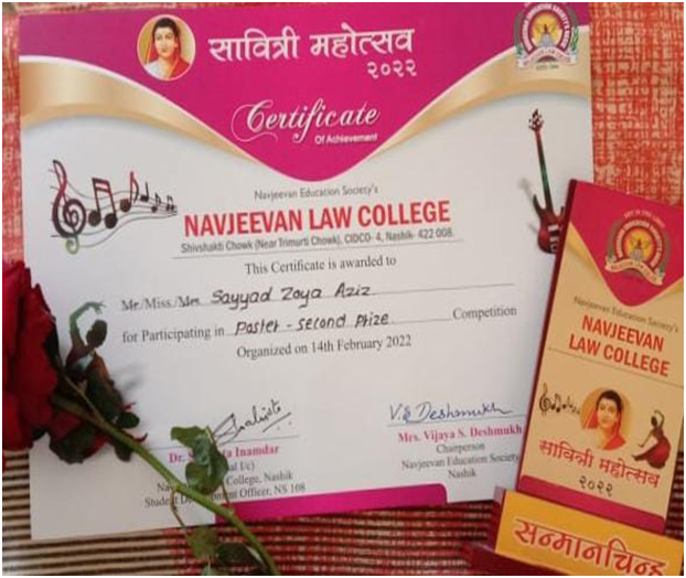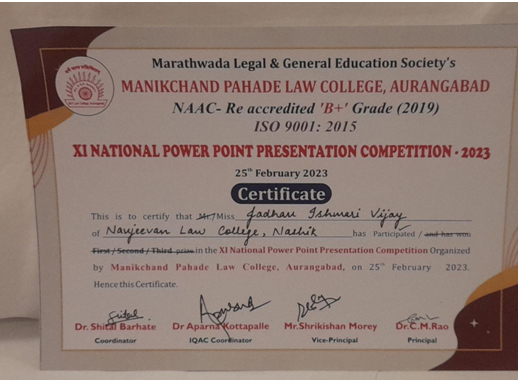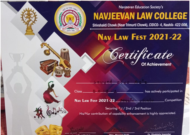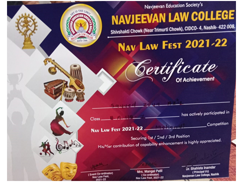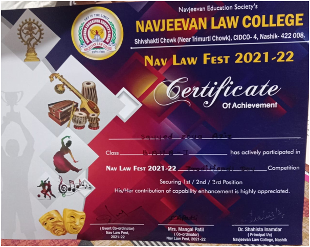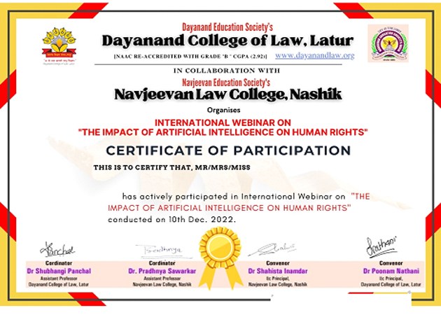 LLB-1 (First Year) received Certificate of participation and representation of Navjeevan Law College, Nashik in International Webinar on ‘THE IMPACT OF ARTIFICIAL INTELLIGENCE ON HUMAN RIGHTS’ conducted on 10.12.2022 by Dayanand College of Law,Latur, Maharastra.