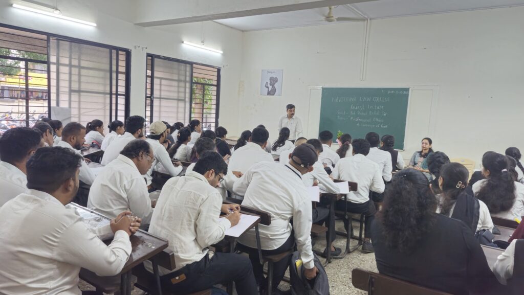 Guest Lecture Organized at Navjeevan Law College, Nashik for LL.B 2 nd year & B.A.LL.B 4th year students on the topic “Professional ethics & Contempt of court”. The lecture was delivered by Prof. Rahul Ballal Sir, Asst. Professor at NDMVP Law College, Nashik, on 15 Sept 2025.
