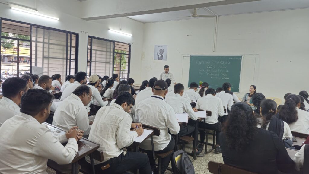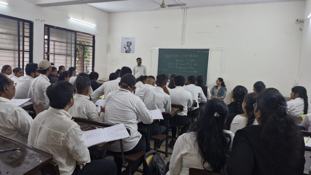Guest Lecture Organized at Navjeevan Law College, Nashik for LL.B 2 nd year & B.A.LL.B 4th year students on the topic “Professional ethics & Contempt of court”. The lecture was delivered by Prof. Rahul Ballal Sir, Asst. Professor at NDMVP Law College, Nashik, on 15 Sept 2025.